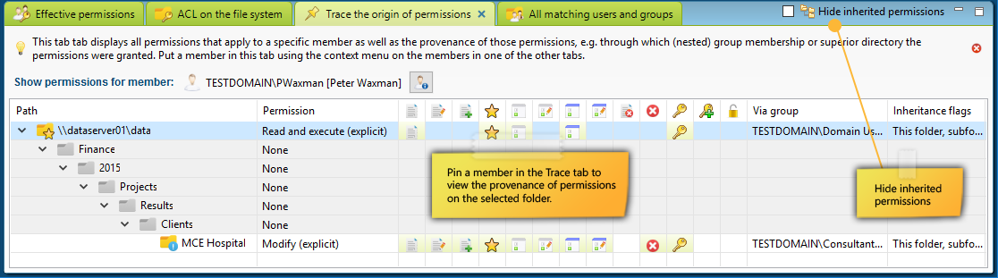 The Trace tab is used to pin a particular member and to view all applicable permissions for the selected folder. The view subsequently displays all permissions that apply to that specific member as well as the provenance of those permissions, e.g. through which (nested) group membership or superior directory the permissions were granted.